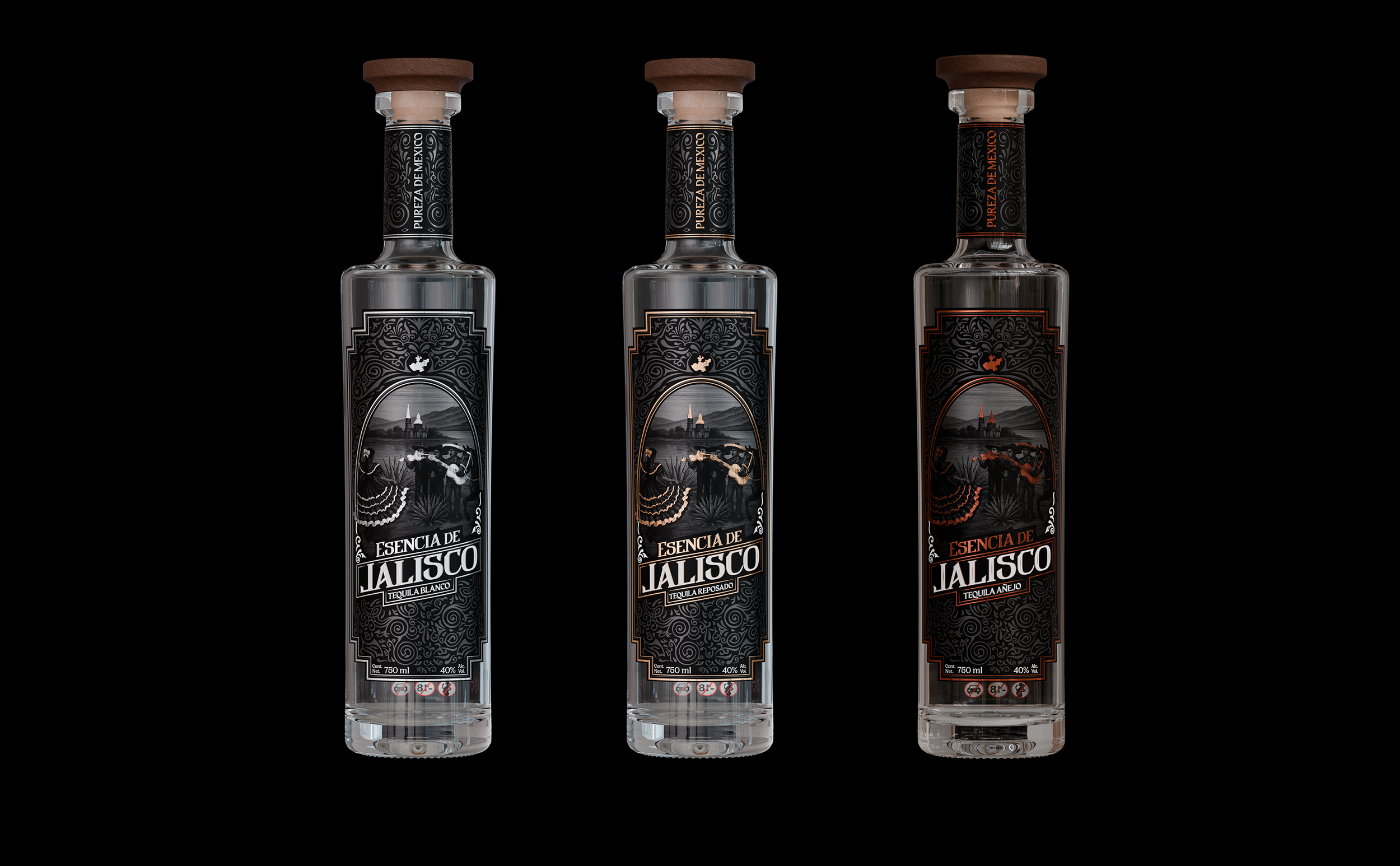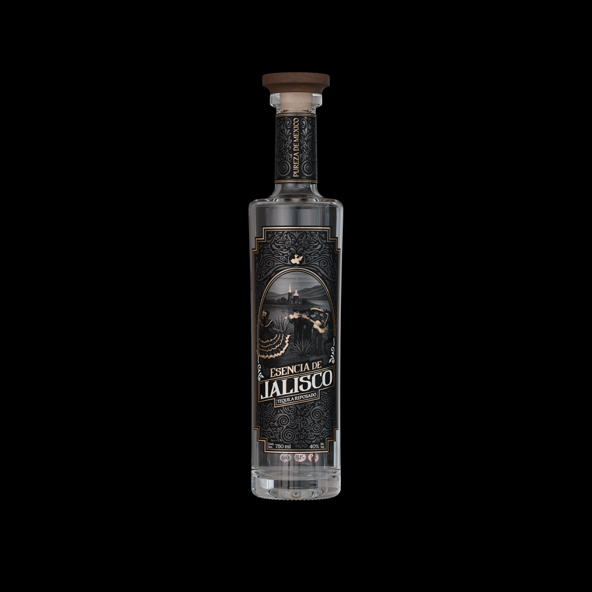 La forma de la botella fue diseñada tomando como referencia la presencia y porte de los mariachis: su silueta firme, su elegancia natural y su carácter icónico. Cada línea y proporción busca transmitir orgullo, arraigo y fuerza, traduciendo la tradición en un objeto con presencia y personalidad en anaquel.